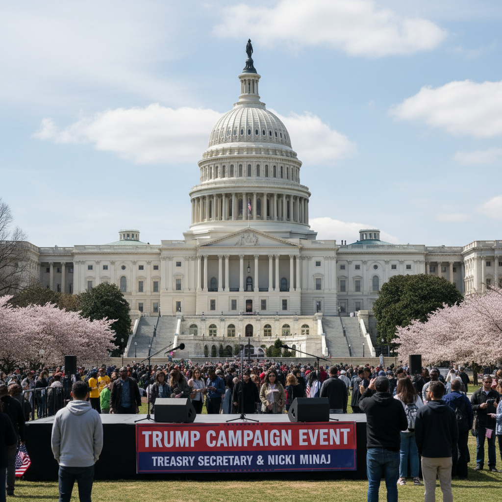Treasury Secretary Scott Bessent appeared on stage with rapper Nicki Minaj at a Trump campaign event on April 15, 2026. Bessent posted on social media that Minaj was a supporter contributing to Trump-aligned accounts, marking an unusual convergence of government officials and entertainment figures at a political rally.